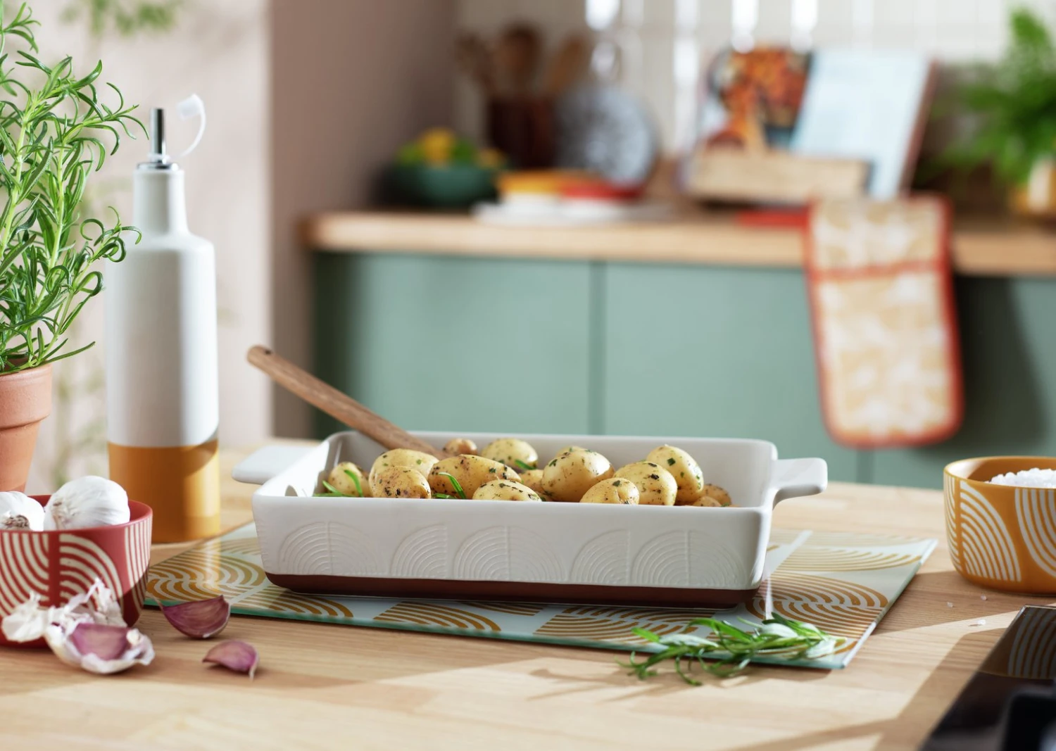 From lasagna to fruit crumbles, our stoneware roaster is your go to dish. With a thick, white patterned glaze, natural terracotta base, and easy grip handles, it's a real oven to table star.