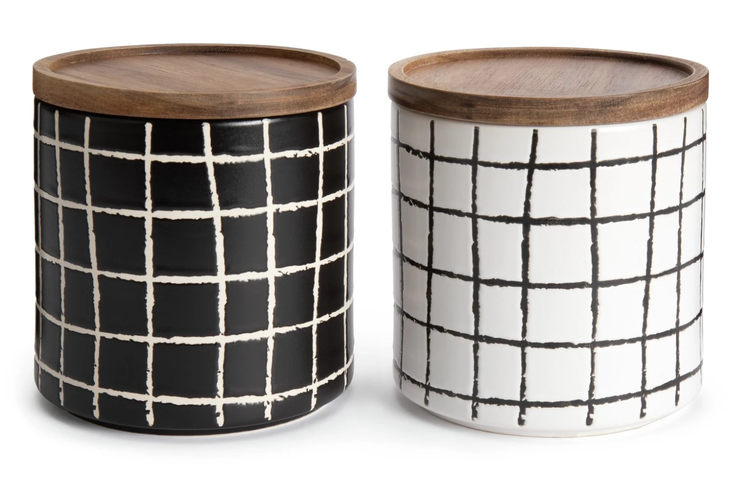 These black and white stoneware storage jars have standout style. Designed with wax relief painted criss cross lines and topped off with airtight lids in a woodgrain effect. A smart way to store your sugar and spice and all things nice.