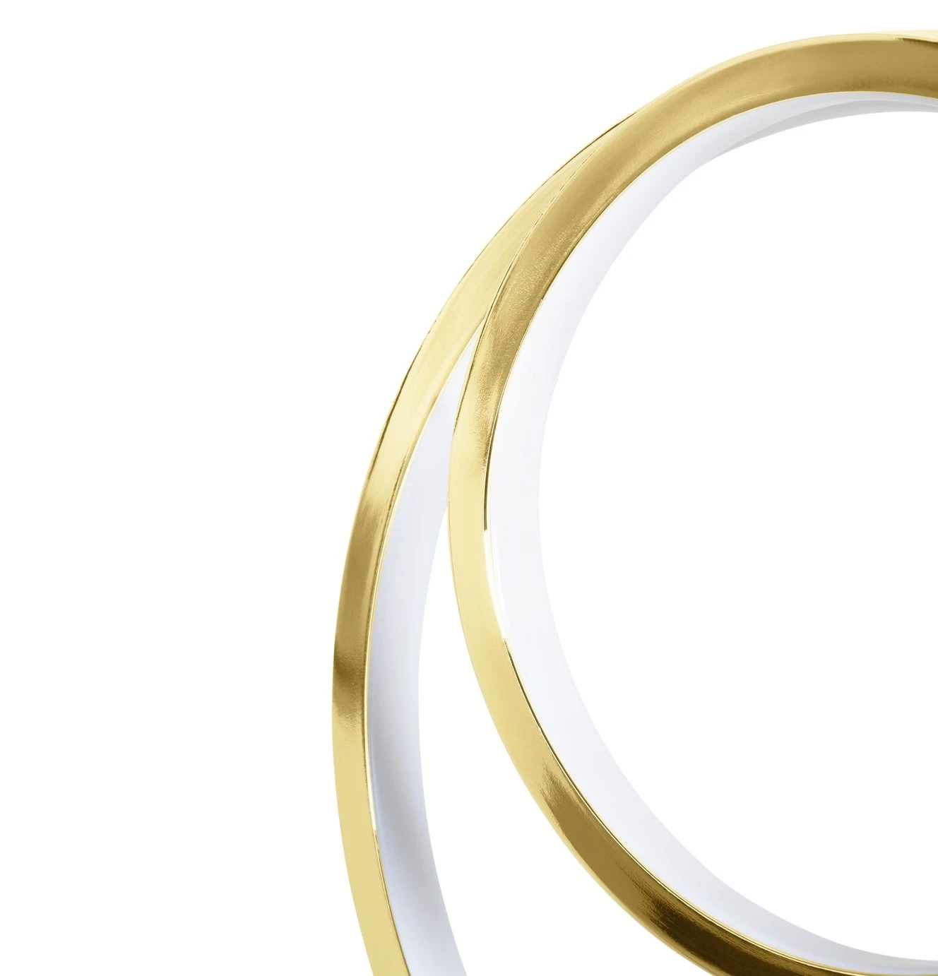 Make a brilliant statement. This showstopping table lamp looks stunning turned on or off. Gleaming brushed brass curves reflect space and light to create a truly polished look. And the smooth integrated LED bulbs radiate circles of light to illuminate the room. Dynamic and different, just flick the switch for a gorgeous, glamorous glow.