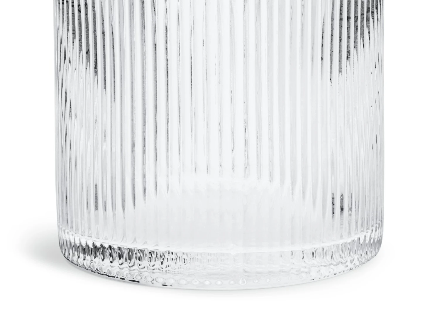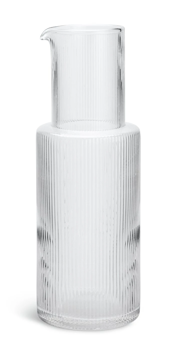 A distinctive hand-blown glass carafe, now that's how to serve water in style. The simple linear design is emphasized by the ribbed texture. Idea for the dining table, or guest room, this is one cool carafe.