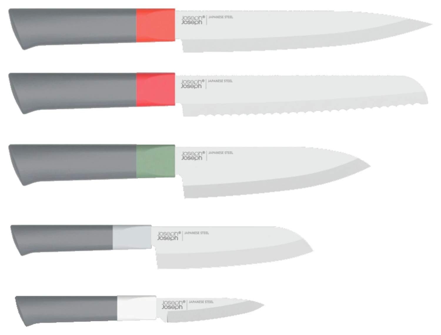 Presented in a sleek grey knife block, this Joseph Joseph Duo set is a kitchen must-have. The knives feature stainless-steel blades and non-slip pinch-grips. They effortlessly slide into the easy-access knife slots of the block. The set includes: 3.5" paring knife, 5" Santoku knife, 6" chef's knife, 8" carving knife and 8" bread knife, covering all your chopping, slicing and carving needs.