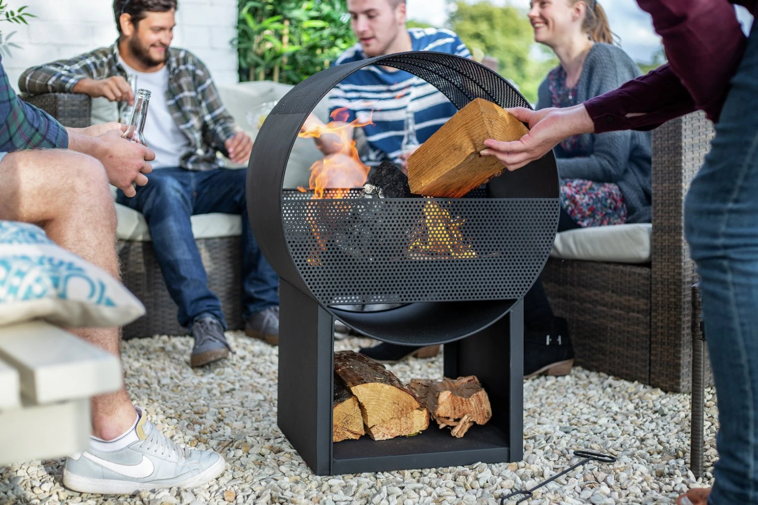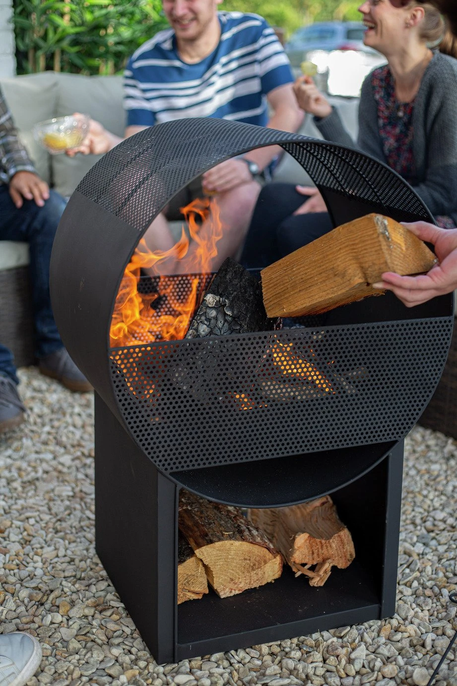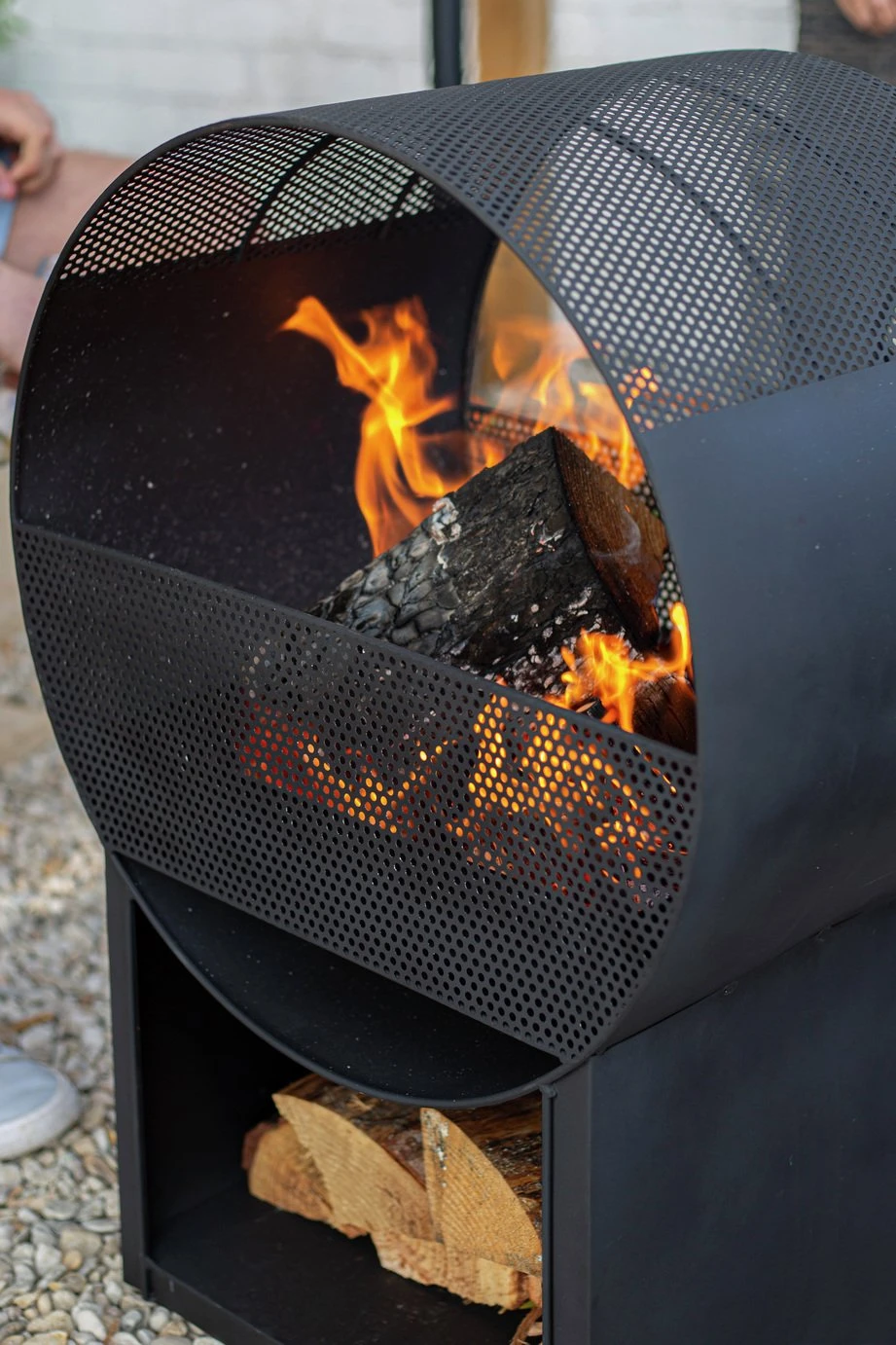 Durable steel construction High temperature black paint finish Contemporary perforated designs Double sided fireplace Includes log store.