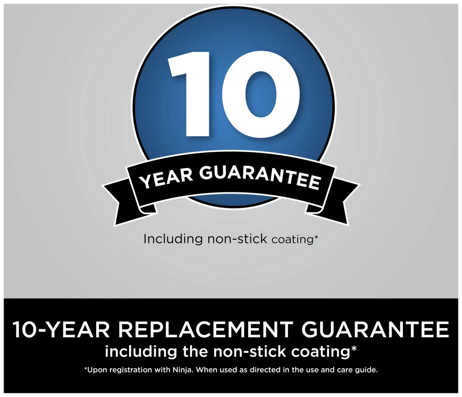 Even heating and no hot spots ensure perfectly cooked results. Cook using little to no oil. Includes heat-tempered glass lid with steam vent. 10-Year Replacement Guarantee, including the non-stick coating. Upon registration with Ninja. When used as directed in the use and care guide.
