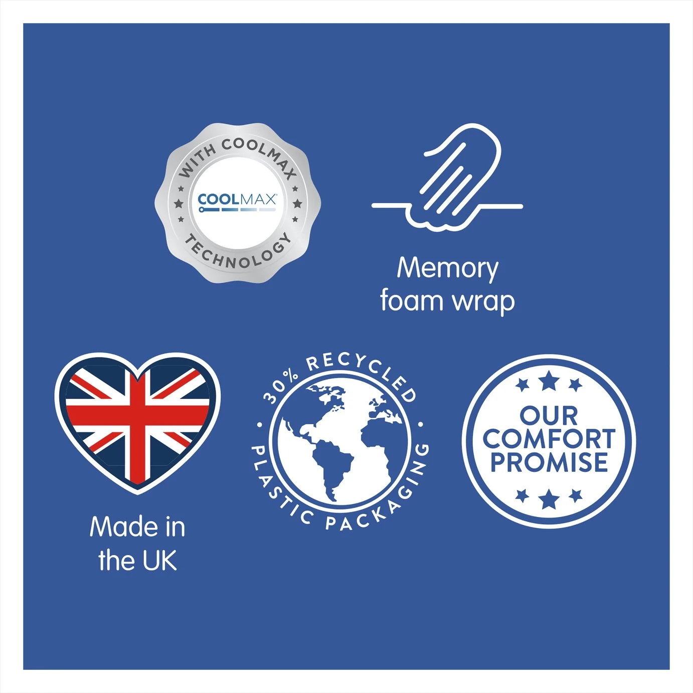 The Slumberdown CoolMax Memory Support Pillow offers maximum support for your head and neck. The memory foam wrap gently moulds around your head and neck which relieves pressure and minimise any neck or back pain. The soft CoolMax cover gently wicks away moisture ensuring your head is kept cool all night. The result is a pillow that is both supportive, cool and wonderfully comfortable. Made in the UK.